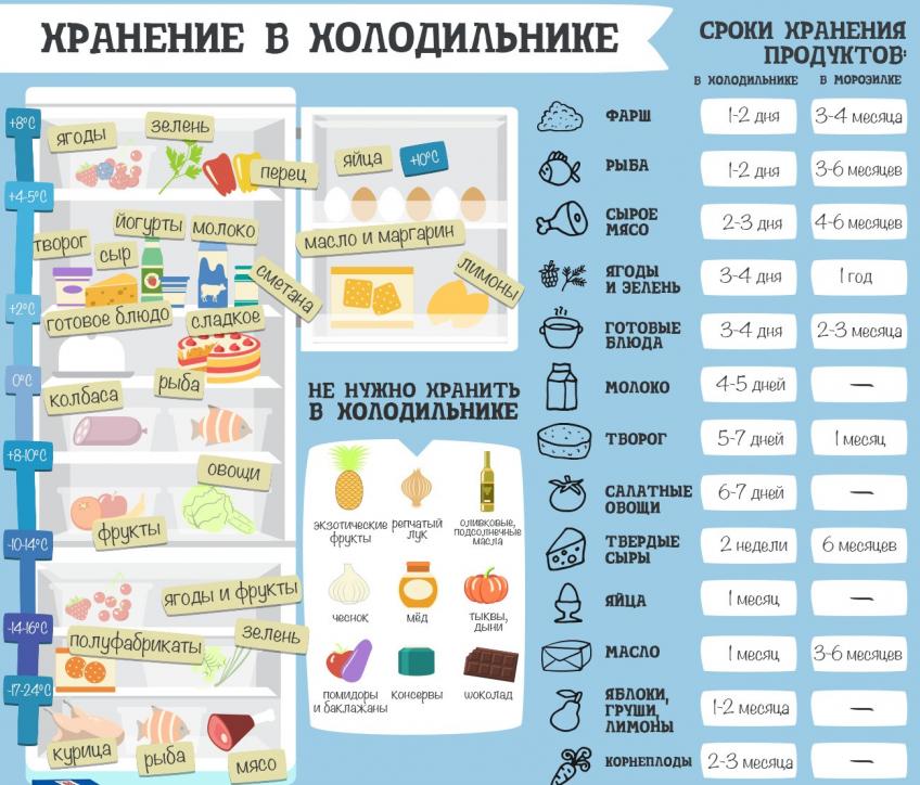 - Если морозилка находится сверху, то на верхних полках будет наиболее прохладно: +2+3 градуса. Это рекомендуемая температура хранения для мяса, рыбы, полуфабрикатов и многих скоропортящихся продуктов.