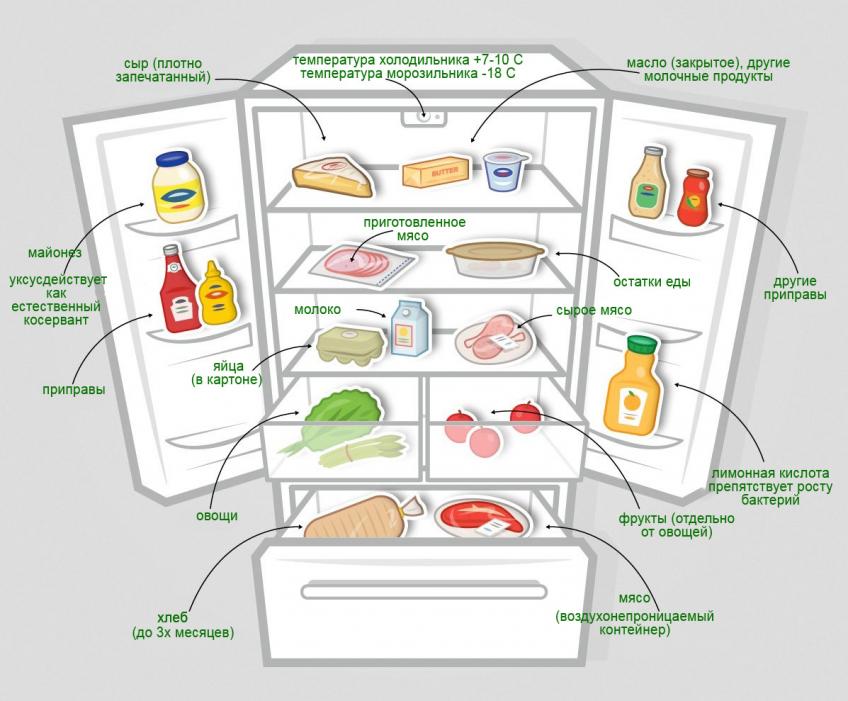 В холодильном отделении не поддерживается один и тот же режим. Самая теплая зона – это верхняя полка. На ней следует размещать различную приготовленную еду, например, супы, каши, жареный картофель, макароны и т. д.