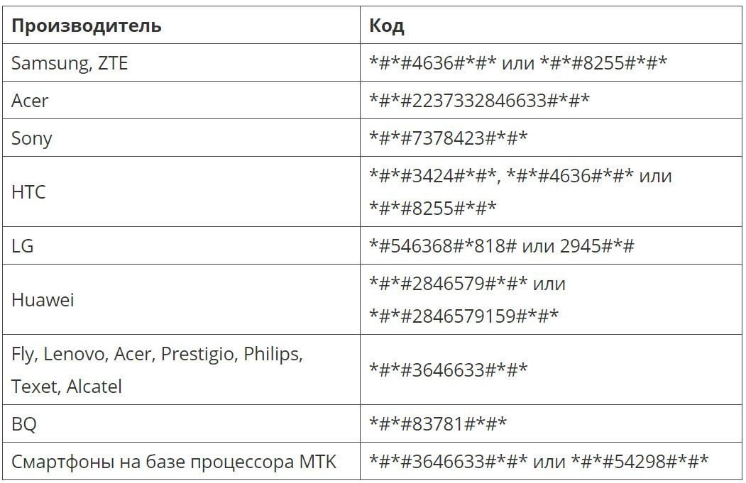 Чтобы попасть в инженерное меню придется ввести определенный номер и нажать клавишу вызова. Для каждой модели устройства он свой. Если на картинке ниже вашего гаджета нет, тогда поищите этот номер в интернете.