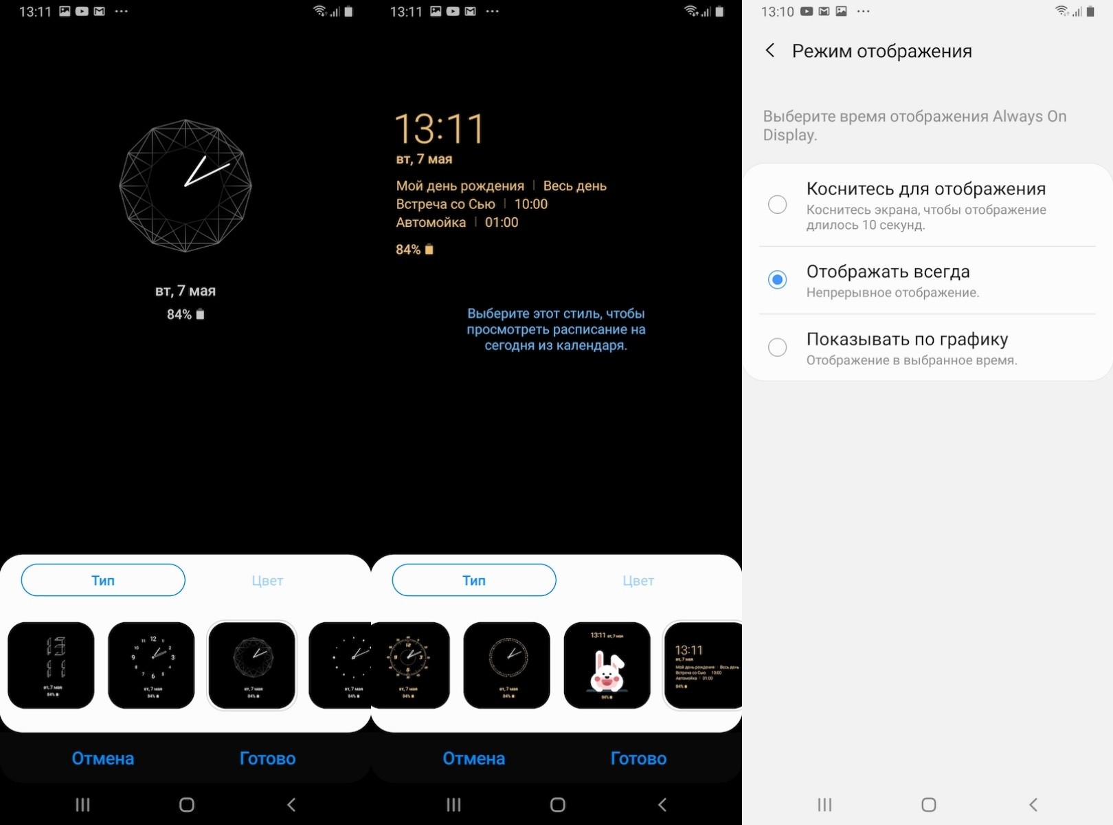 В настройках можно «поиграться со шрифтами» и выбрать несколько стилей оформления экрана в режиме ожидания, подобрав цвет и формат уведомлений. Фирменный режим Always On Display — штука удобная, при желании его можно отключить, если захочется сэкономить заряд аккумулятора. Но при повседневном использовании эта функция на время работы не влияет.