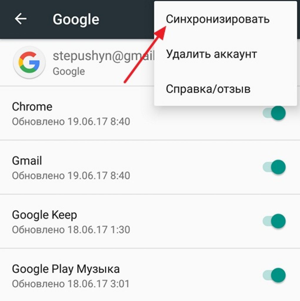 Для запуска немедленной синхронизации аккаунта, нужно кликнуть в верхнем правом углу экрана на кнопку. Будет отрыто меню, где следует выбрать «Синхронизировать».