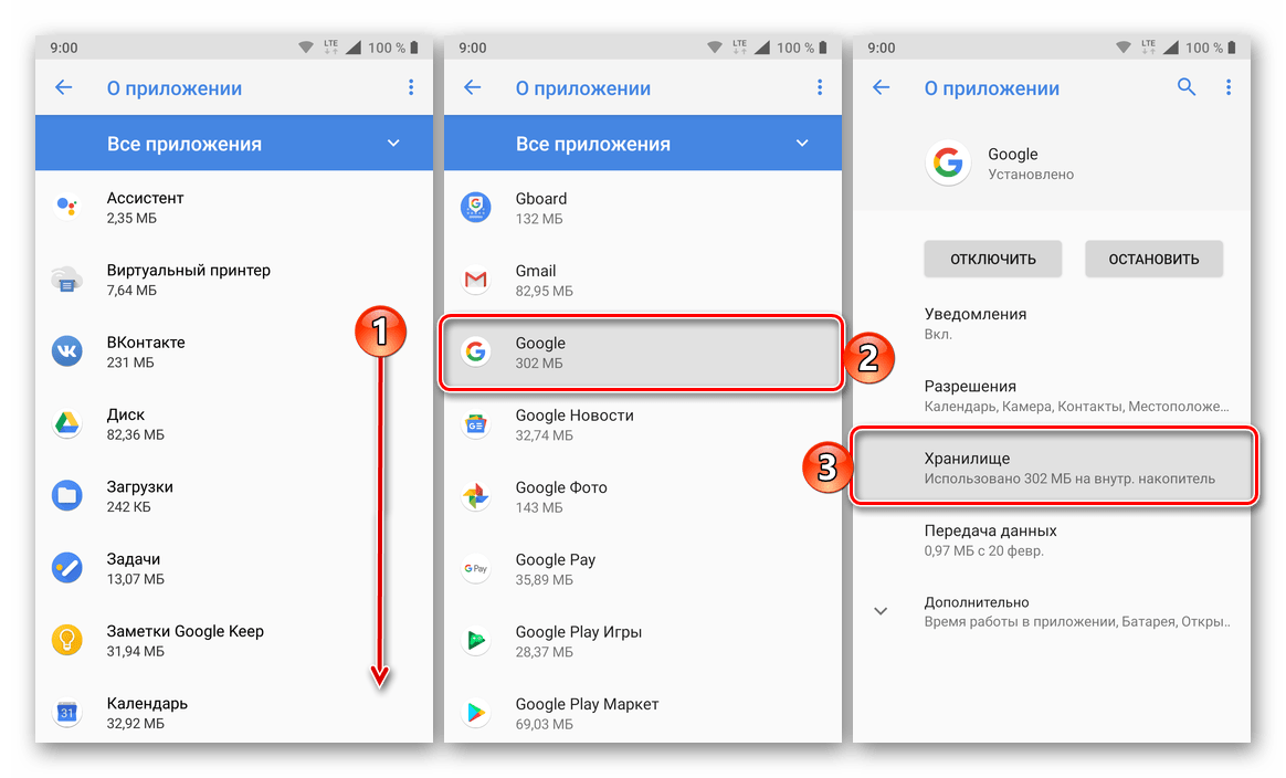 Отыщите в этом перечне Google, тапните по нему для перехода на страницу «О приложении», а затем откройте раздел «Хранилище».
