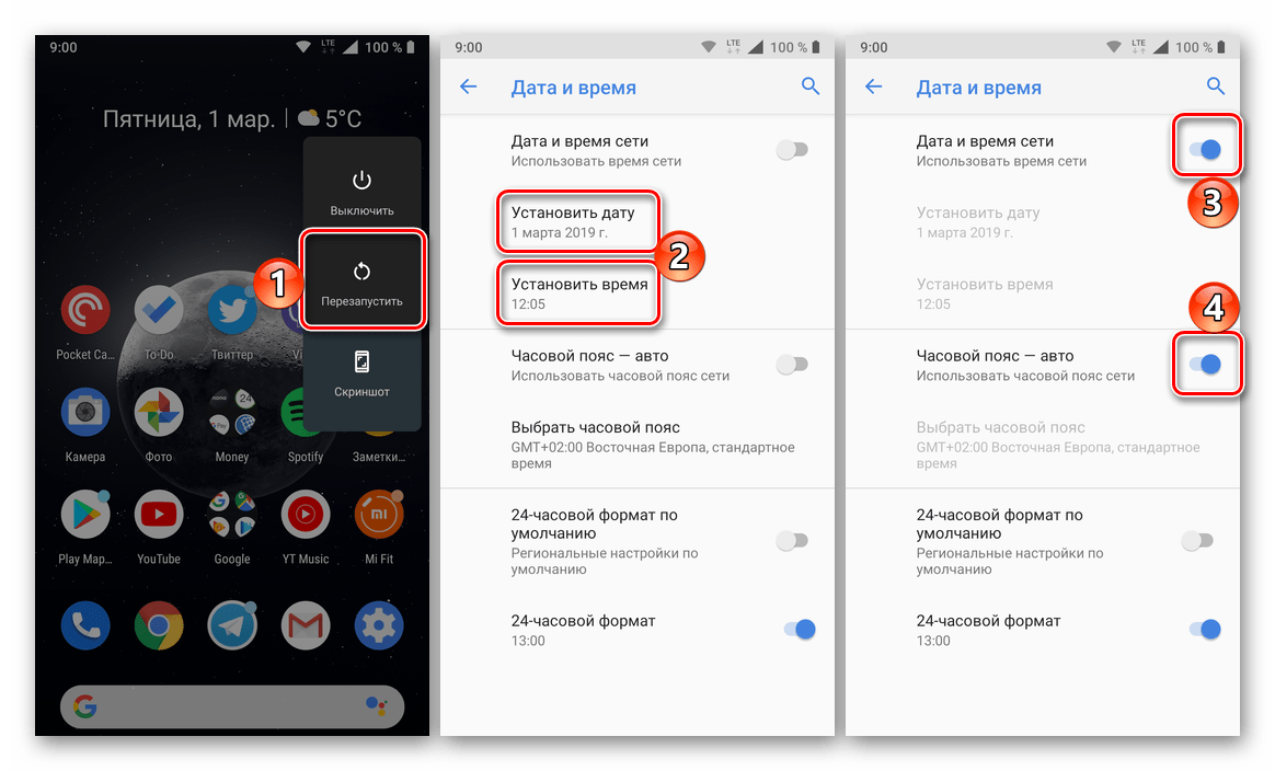 Перезагрузите мобильный девайс и повторите действия из двух предыдущих пунктов, но в этот раз вручную установите правильные дату и время, а затем включите их автоматическое определение, снова переведя переключатели в активное положение.
