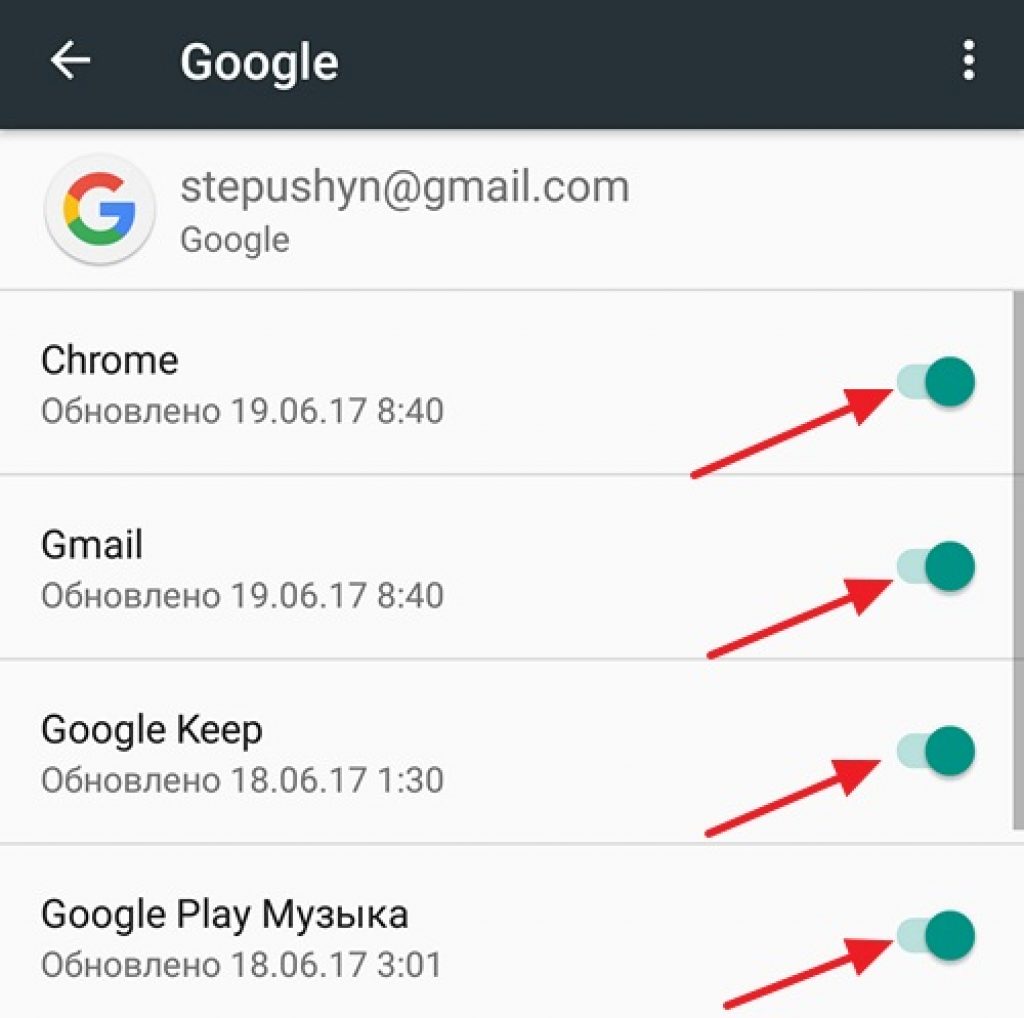 После выбора аккаунта Гугл, перед пользователем будут продемонстрированы настройки синхронизации для данного аккаунта. Здесь можно отключить или включить синхронизацию множества сервисов, например, заметки Google Keep, почта Gmail, веб-браузер Chrome и многое другое. Для включения синхронизации переводим переключатель напротив необходимых сервисов в положение «Включено».