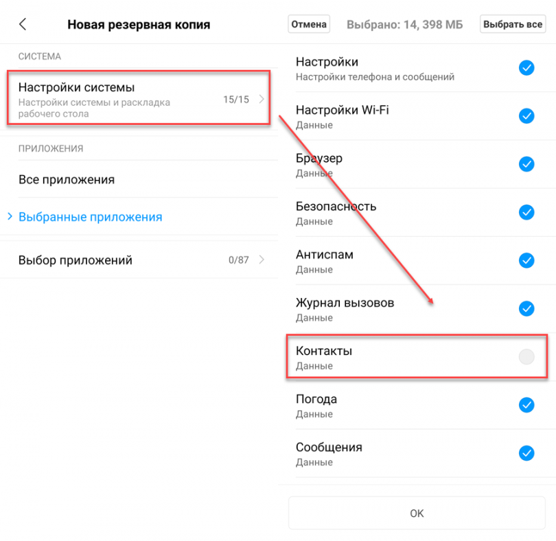 Шаг 3. Если вы не хотите синхронизировать контакты Андроид, то выберите пункт «Настройки системы». Здесь снимите галочку со строчки «Контакты» и нажмите на кнопку «Ок», чтобы подтвердить действие.