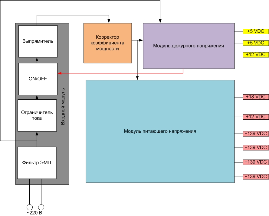 - на модуль основного напряжения питание подано всегда, а коммутация ON/OFF производится по вторичной стороне.