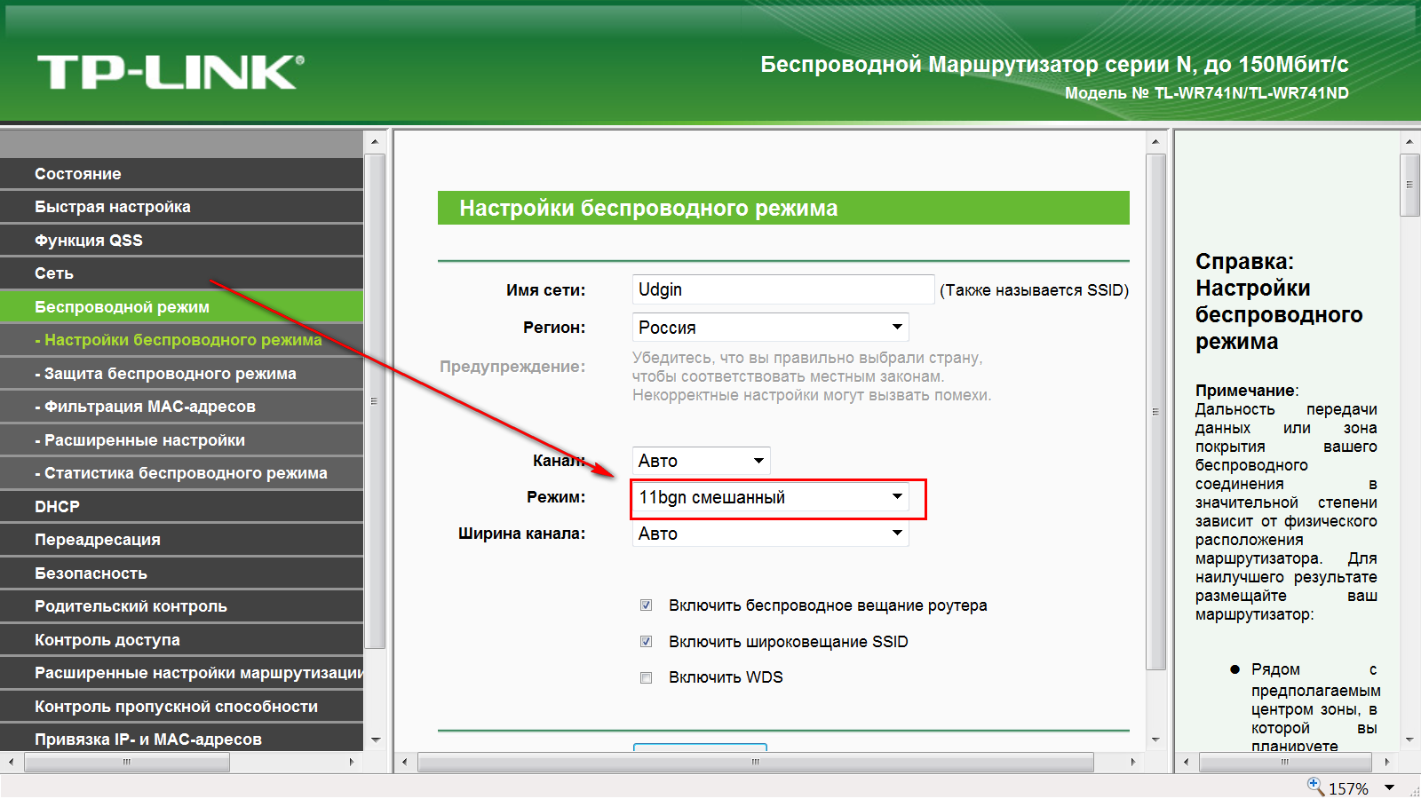Проверьте, по какому стандарту работает беспроводная сеть. Если ваш телефон старый модели, а роутер настроен на современный стандарт 802.11n или 802.11ac, подключения не произойдет. Для совместимости нового маршрутизатора со старыми клиентскими устройствами необходимо переключить его в режим 802.11bgn (смешанный).