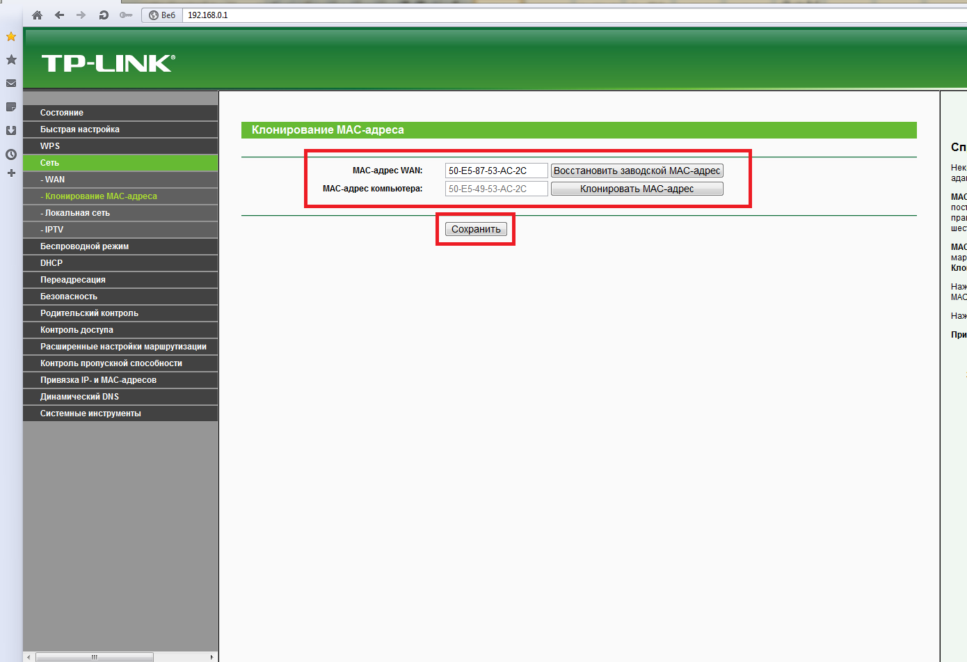 - Зайдите во вкладку «Сеть». Наименования вкладок может отличаться в зависимости от модели используемого маршрутизатора. Во вкладке «Сеть» удостоверьтесь что МАК-адреса устройства и компьютера идентичны;