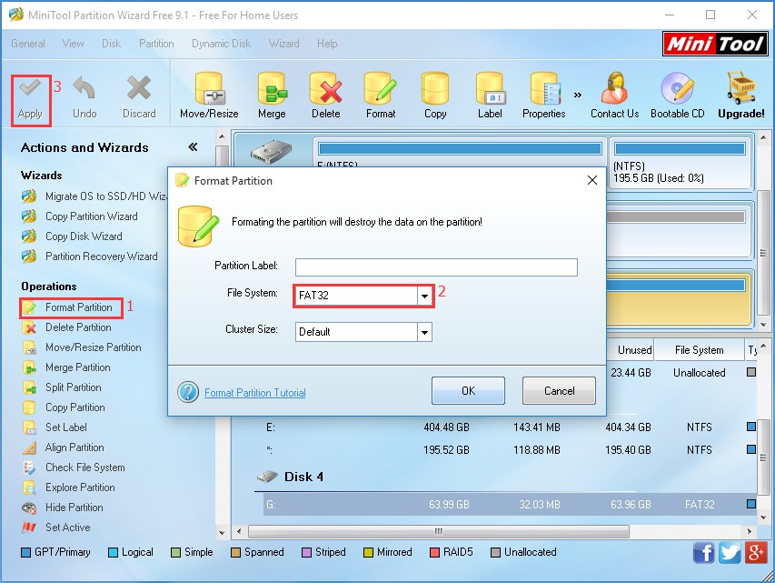 - в окне, открывшемся на рабочем столе выбираем файловую систему Fat 32;