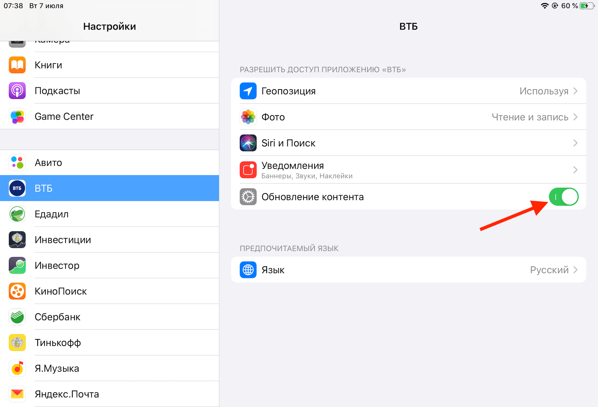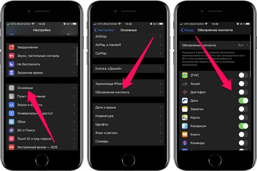 Вы должны перейти в меню «Настройки» → «Основные» → «Обновление контента» и вручную отключить приложения, которые по вашему мнению не должны работать в фоновом режиме. Отключать функцию «Обновление контента» полностью не советуем, так как некоторые важные для вас приложения автоматически потеряют возможность подгрузки контента в фоновом режиме.