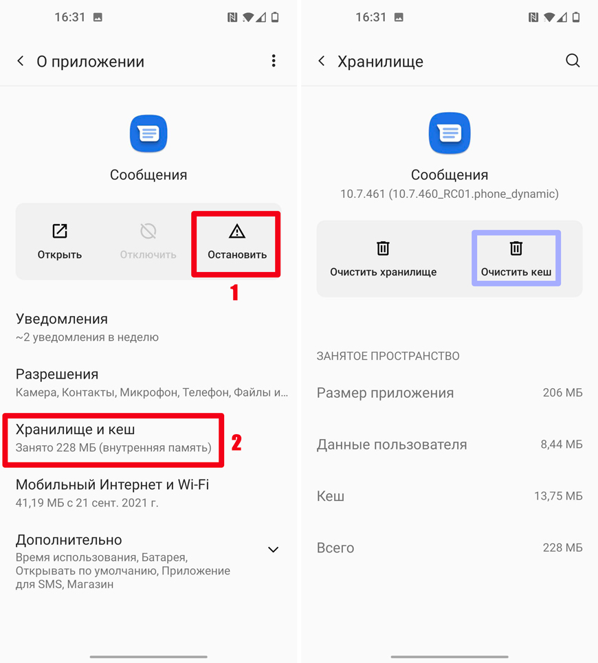 Сначала попробуйте просто «Остановить» программу и попробуйте снова отправить СМС. Если это не помогло, перейдите в «Хранилище и кеш» и очистите кеш, который может мешать работе программного обеспечения. Есть еще вариант — очистить хранилище, но в этом случае все смс будут удалены с телефона