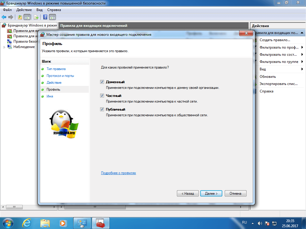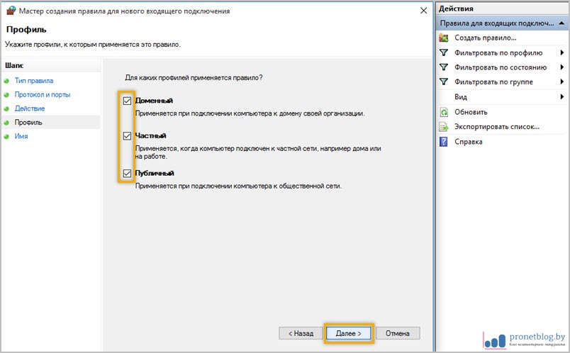 Далее указываем на какой сетевой профиль будет оно применяться, доменный это для локальных сетей организаций, частный для домашних сетей, а публичный, для внешнего мира.