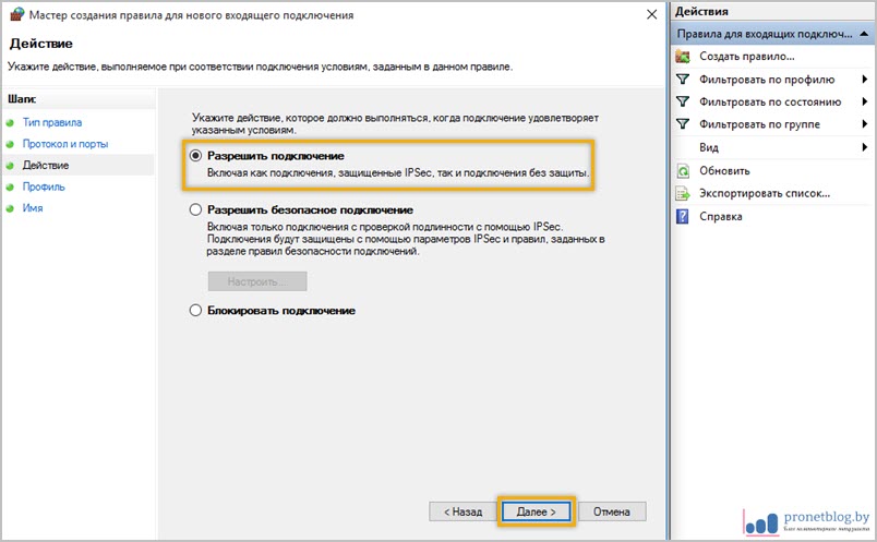 Действие “Разрешить подключения” разрешает абсолютно все сетевые соединения на этот порт – этот вариант актуален в большинстве случаев.