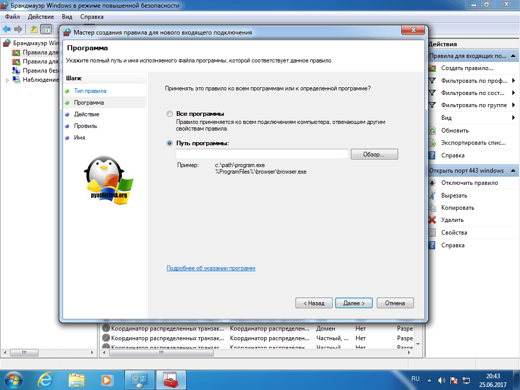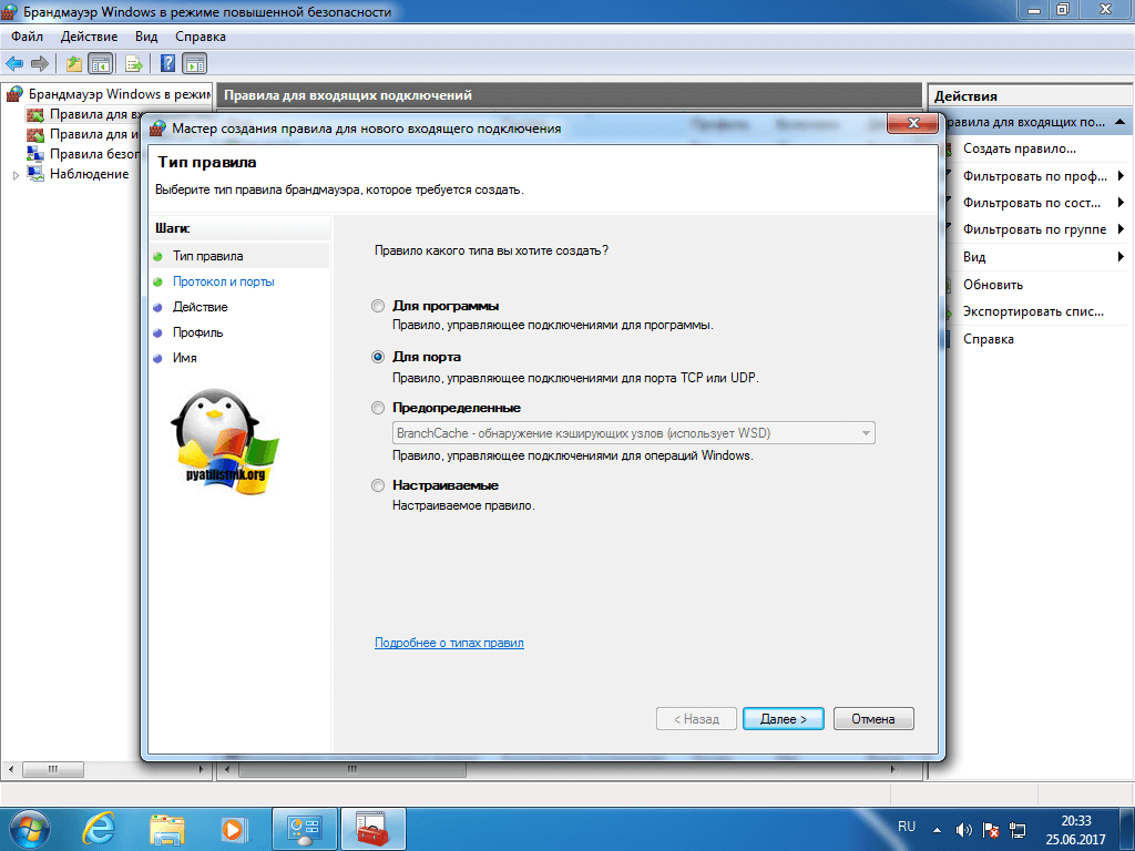 Тут нам интересны два пункта, первый это «Для программы», удобен тем, что вы разрешаете конкретной программе все подключения через фаэрвол, из недостатков, то что если у нее есть зависимые программы, то работать может не полностью или вообще не будет, второй вариант для порта, удобен тем, что единожды открыв нужный порт, вам не нужно думать какая для какой программы вам его разрешать. Простой пример вы используете 80 сокет, сначал он работал на Apache, потом вы его заменили на IIS, в брандмауэре ничего не пришлось менять.