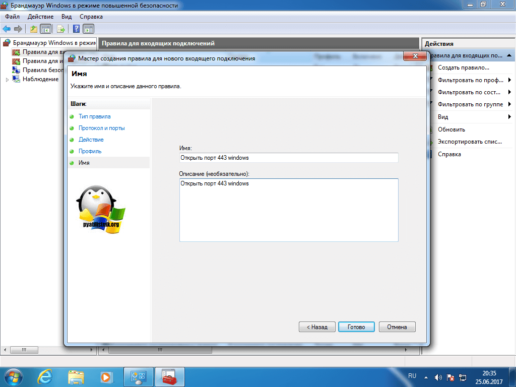 Все задаем имя для создаваемого правила и нажимаем готово.