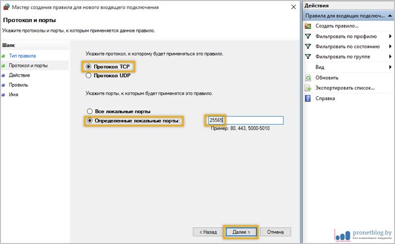 На следующем шаге выбираем протокол и, собственно, сам номер порта, который пытаемся открыть. Поскольку эта статья посвящается любителям игры Майнкрафт, то, естественно, его номер будет 25565.