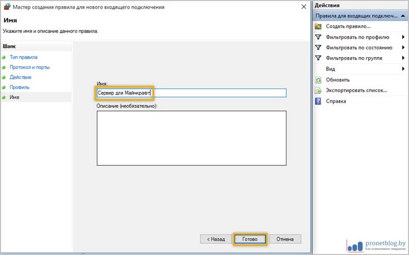 На завершающем шаге нужно придумать осмысленное имя только что созданному правилу, чтобы потом его можно было отыскать в бесконечном списке сетевых параметров брандмауэра Windows 10 и 7.