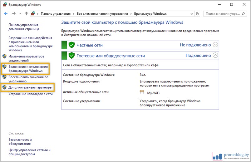 Если вам нужно быстро протестировать 443 соединение, то я вам советую полностью отключить брандмауэр, особенно если подпирает время, для этого открываем соответствующий пункт.