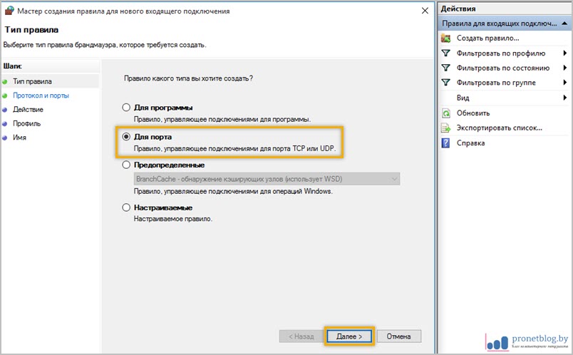 - Мы выбираем Вступление правил если мы хотим открыть порт или Выход правил если мы хотим закрыть это.