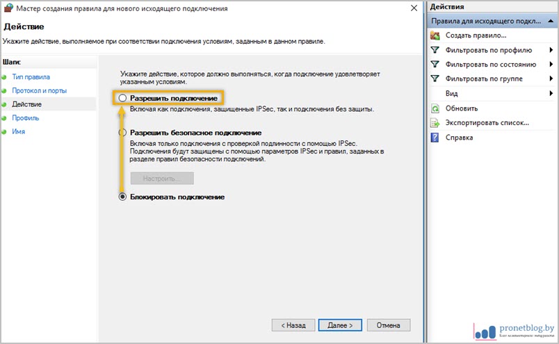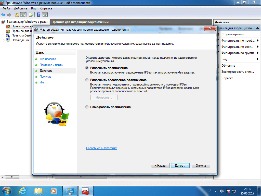 Только будьте очень внимательными при настройке выбора действия. Почему-то изначально брандмауэр предлагает “Блокировать подключение”. Это нам не нужно, поэтому ставим галочку напротив пункта “Разрешить подключение”.