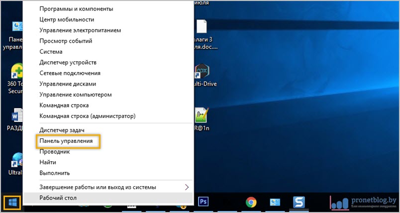 Первым делом жмем правой кнопкой мыши по значку “Пуск” и идем в “Панель управления”.