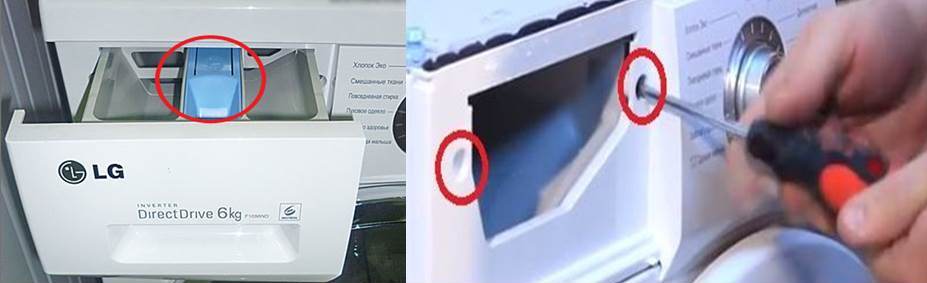 Открываем отсек для порошка, надавливаем на центральную ячейку и достаем выдвижной ящичек. Крестовой отверткой развинчиваем саморезы, на которых крепится лоток. Теперь займемся крышкой машинки. На задней стенке находим винты, которые ее держат, и раскручиваем их той же крестовой отверткой.