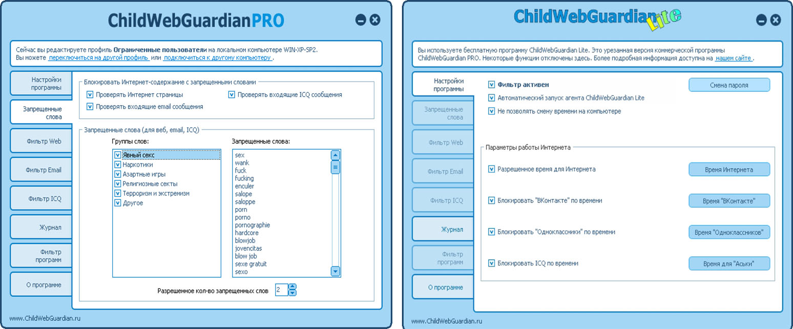 На самом деле, родительский контроль Windows 7 и XP не слишком отличается. Как уже описывалось выше, можно установить ограничение работы компьютера по времени. Причем возможно выбрать не только период в часах и минутах, но и целые дни, когда ПК нельзя будет включить под детской учетной записью. Также сможете блокировать конкретные приложения, игры и программы, которые также будут недоступны пользователям, находящимся под контролем. Для остальных функций можно скачать специальные программы родительского контроля, которые легко найти в Интернете.