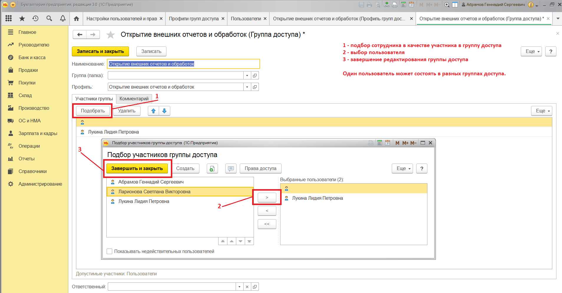 Чтобы создать необходимую группу пользователей, их можно выбрать из базы. Здесь нужно проверить, что установлены флажки «Вход в программу разрешен» и «Показывать в списке выбора». Если их не будет, то при авторизации пользователь себя не увидит.