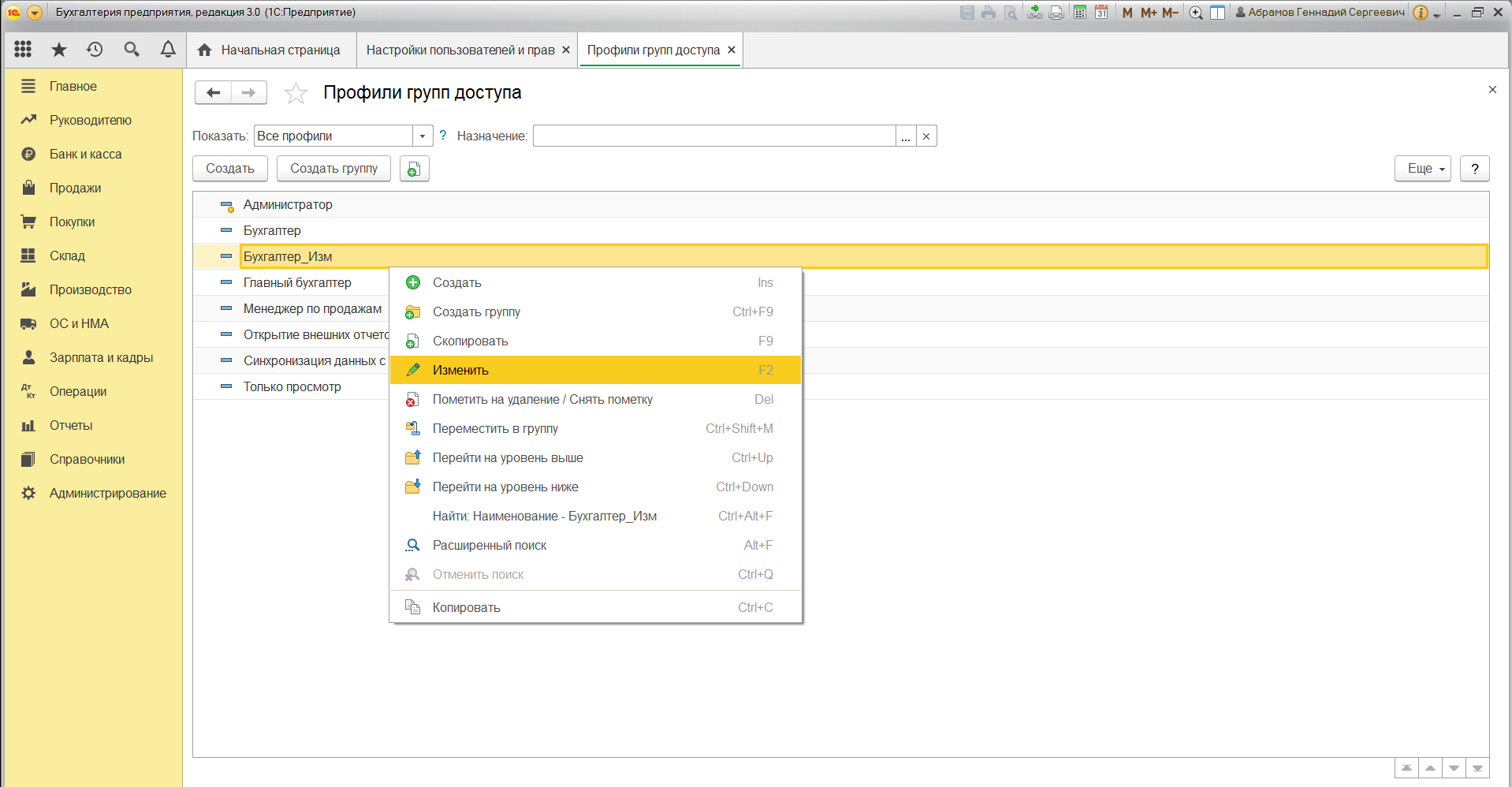 Допустим, что вам необходимо разрешить группе бухгалтеров редактировать реквизиты объектов. Для этого зайдите в раздел «Профиль групп доступа». Установите флажок «редактировать реквизиты объектов».
