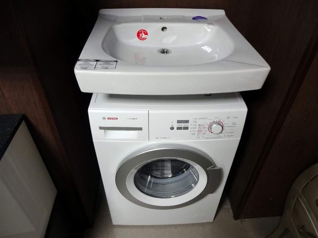 - При выборе стиральной машины особое значение будут иметь ее габариты. Максимальная высота – не более 80 см, и это при условии, что раковина будет располагаться на расстоянии 1 метра от поверхности пола. Глубина тоже не должна быть большой, следует учесть, что между машинкой и стеной должно оставаться свободное пространство для подводки коммуникаций. Так, при глубине умывальника 50 см максимальная глубина машинки составляет 36 см, при 60 см – 50 см. Понятно, что при такой компоновке можно использовать машинки только с горизонтальной загрузкой.