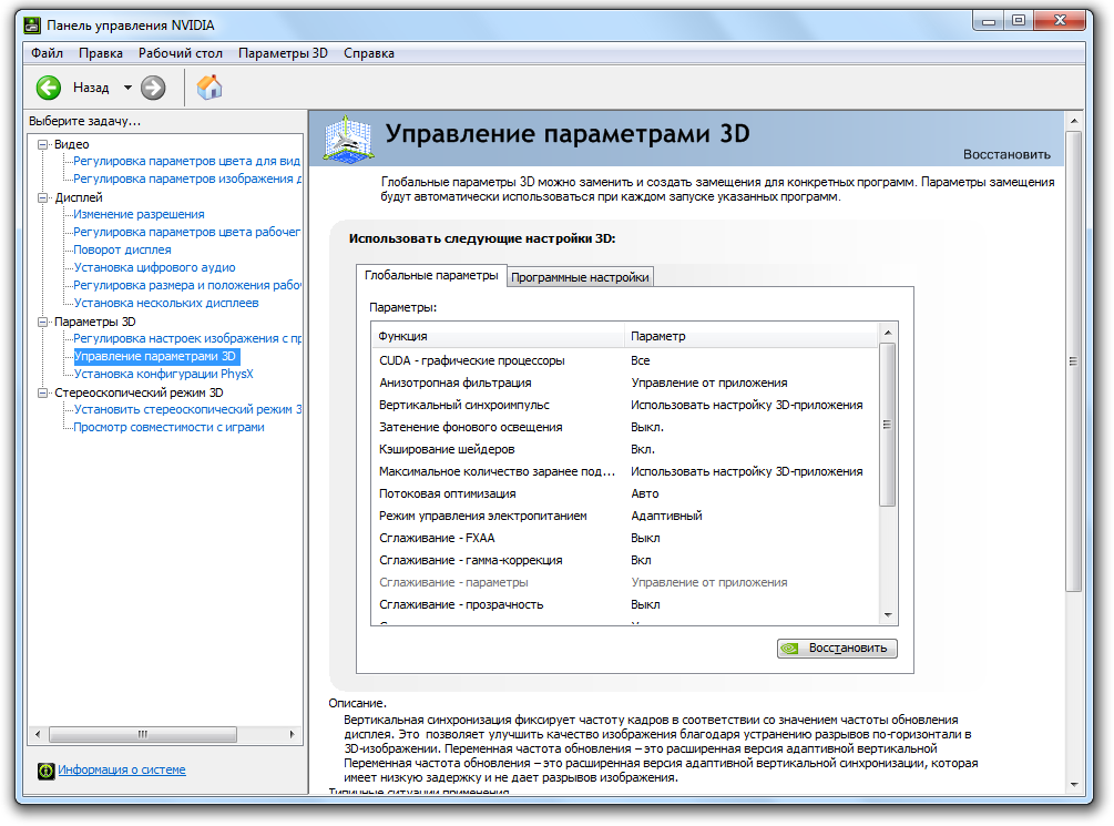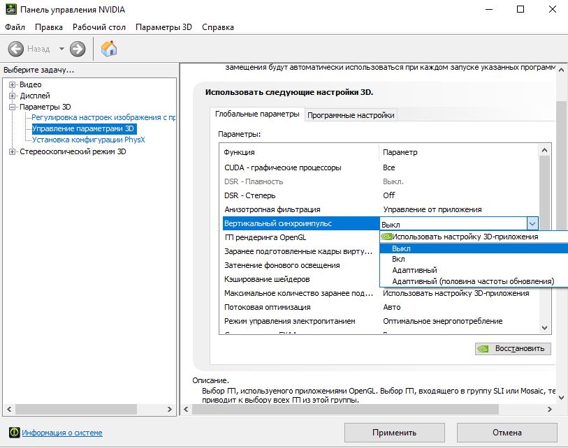 - «Управление параметрами 3D» > «Вертикальный синхроимпульс» и выключите эту функцию.
