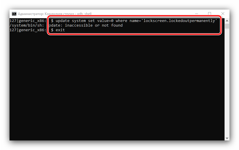 Перезагрузите устройство, а после загрузки системы попробуйте ввести любой графический ключ – в большинстве случаев девайс должен быть разблокирован. Если не сработало, повторите шаги 2-3, после чего дополнительно введите следующее: adb shell rm /data/system/gesture.key